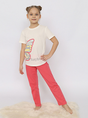Пижама гладкокрашенная из футболки и брюк. Футболка свободного покроя с коротким рукавом. Горловина обработана притачной бейкой из рибаны с лайкрой. На правом боку принт в виде бабочки. Прямые брюки умеренного объёма выполнены из полотна дополнительного цвета. Цельнокроенный пояс обработан плоским швом вподгибку с одновременным прокладыванием резинки.