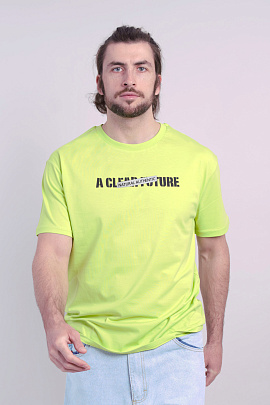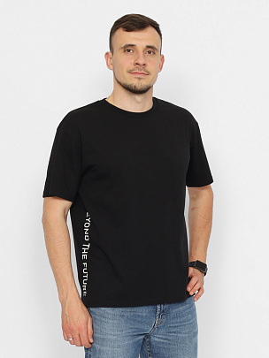 Футболка прямого силуэта длиной до бедер. Короткий рукав. Круглая горловина обработана узкой притачной обтачкой из рибаны с эластаном. Полочка декорирована принтом и текстильной нашивкой "ясное будущее естественное и аутентичное".