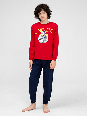 Пижама для мальчика из джемпера и брюк. Джемпер с круглой горловиной и длинными рукавами с манжетами из полотна с добавлением эластана. Брюки без карманов, пояс цельнокроеный с эластичной резинкой внутри. Низ брюк с притачными манжетами из полотна с добавлением эластана. Перед декорирован принтом "Limitless" Безграничный.