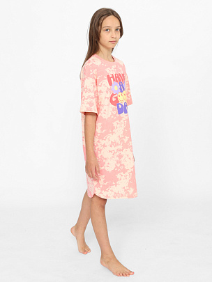 Ночная сорочка, домашнее платье, туника для девочки оверсайз с коротким рукавом, средней длины и свободного кроя, подходит к фигуре любого типа. Стильная, модная, туника для девочки-подростка выполнена из 100% органического хлопка. Легкая и дышащая текстура материала подарит комфортные ощущения. Перед декорирован трендовым принтом (надпись: Хорошего дня).