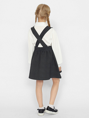 Сарафан школьный для девочки из футера, с оригинальным V-образным вырезом на груди. Сарафан школьный для девочки имеет красивые переплеты лямок, легко сочетается с блузой, лонгсливом, водолазкой. Сзади застежка на пуговицы.