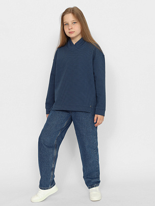 Трикотажный детский джемпер для девочек из набивного футера - имитирует костюмную ткань, с воротником-стойкой. Свитшот имеет спущенные рукава и свободный силуэт. Боковые швы переходят на перед. На рукавах и снизу толстовка отделана манжетами и поясом из основного полотна. Спереди декоративный металлический лейбл.