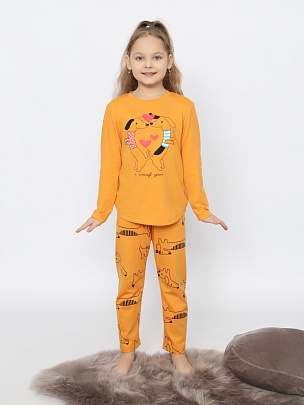 Легкая, мягкая и приятная к телу пижама детская выполнена из гипоаллергенного трикотажа с начесом. Воздухопроницаемая ткань обеспечивает оптимальную терморегуляцию. Джемпер со спущенным плечом, длинными рукавами и эластичными манжетами. Перед декорирован милым принтом (надпись: Мы все мечтаем о поп-корне). Штанишки для девочки, из набивного полотна, в составе комплекта для дома снабжены удобной резинкой-поясом, не сдавливающей живот. Пижама с длинным рукавом имеет комфортные манжеты - на рука...