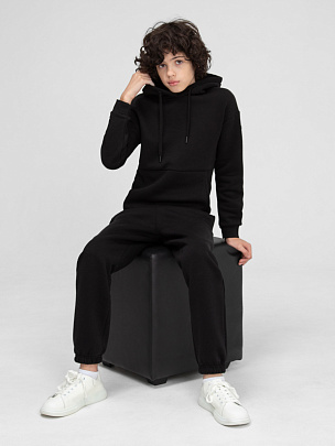 Свободные трикотажные брюки из плотного футера без начеса с карманами. Пояс притачной с резинкой и функциональным шнуром. По низу брюки собраны на резинку.