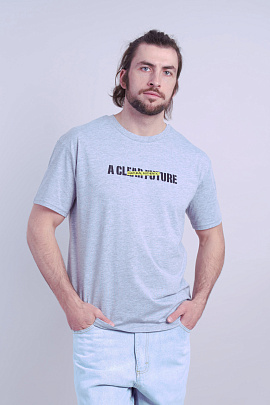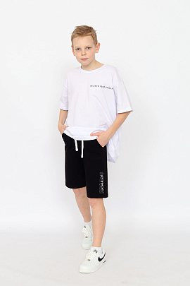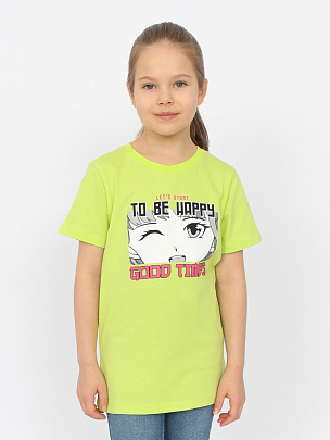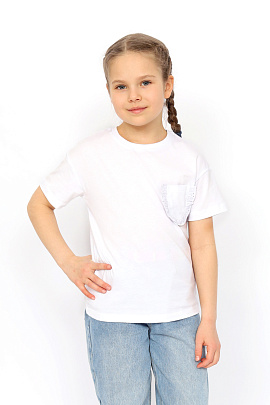 Футболка прямого силуэта с короткими рукавами. Горловина круглая, обработана притачной бейкой из рибаны с лайкрой. Перед футболки декорирован блестящим принтом, имитирующим пайетки.