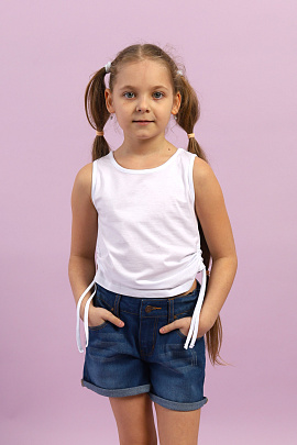 Футболка прямого силуэта с короткими рукавами. Горловина круглая, обработана притачной бейкой из рибаны с лайкрой. Перед футболки декорирован блестящим принтом, имитирующим пайетки.