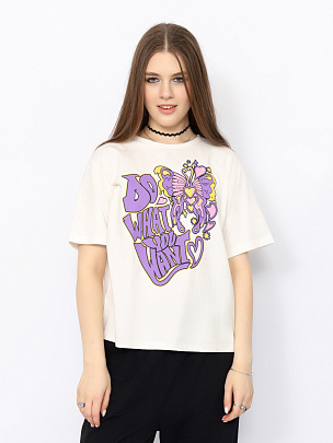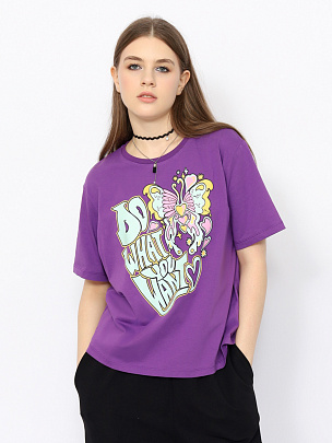 Футболка oversize с короткими рукавами. Горловина круглая, обработана притачной бейкой из рибаны с лайкрой. Перед футболки декорирован принтом с использованием глиттера.