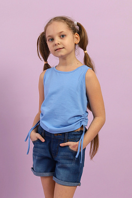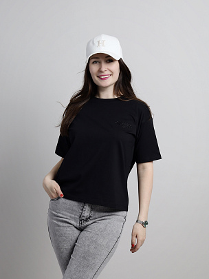 Футболка oversize с короткими рукавами. Горловина круглая, обработана притачной бейкой из рибаны с лайкрой. Перед футболки декорирован принтом с использованием глиттера.
